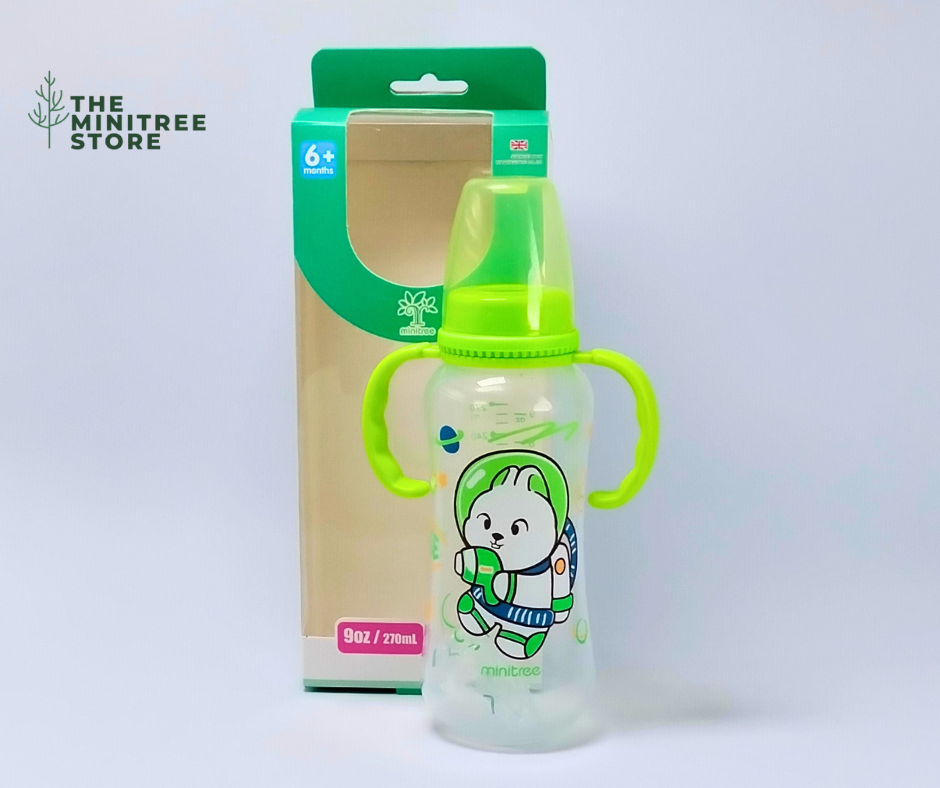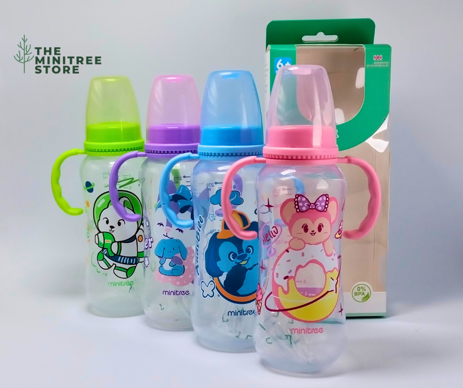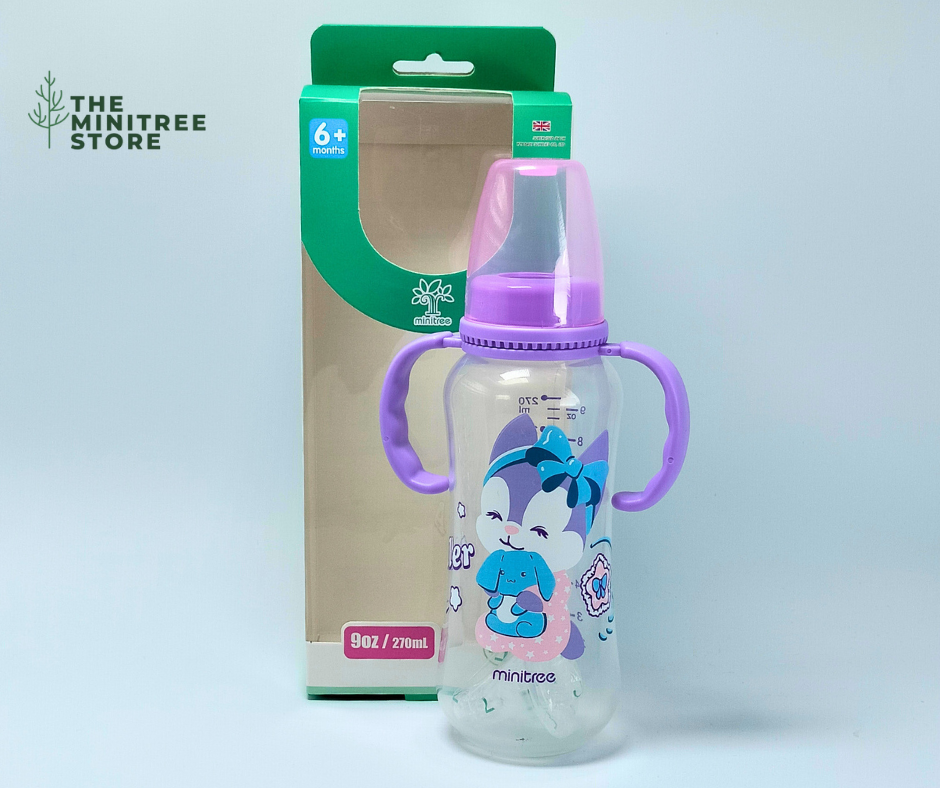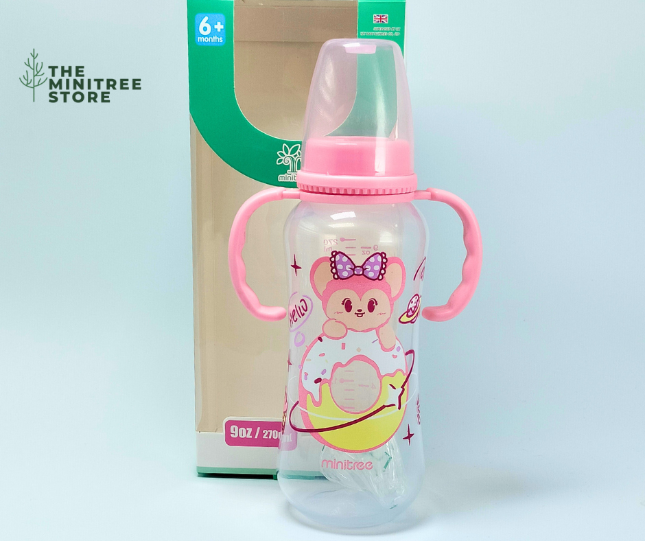 Make every feeding moment fun, safe, and comfortable with the Minitree 9oz/270ml Baby Feeding Bottle with Handles. Featuring bright colors and adorable cartoon designs, this feeding bottle is perfect for little hands and growing babies.